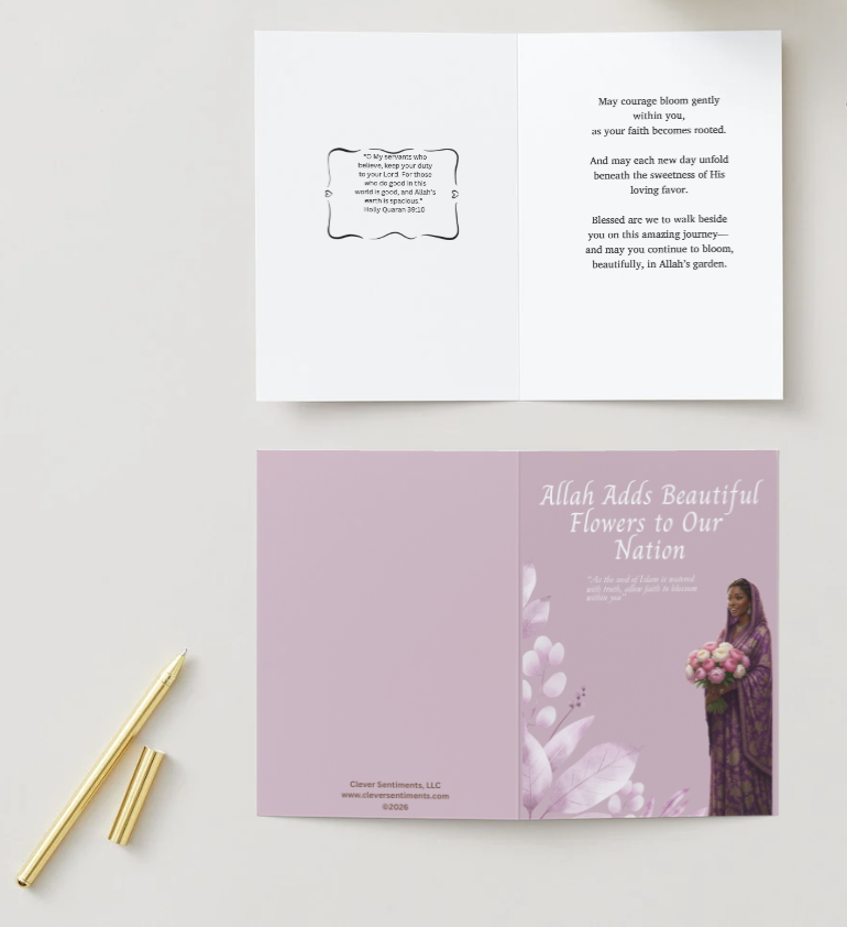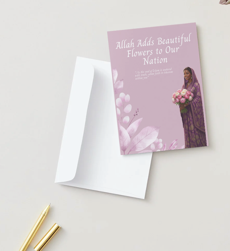 Welcome the newest member with the ‘Allah Flowers New Sister greeting card, designed to offer spiritual encouragement and heartfelt support. A perfect way to share positivity and strengthen bonds in your community.