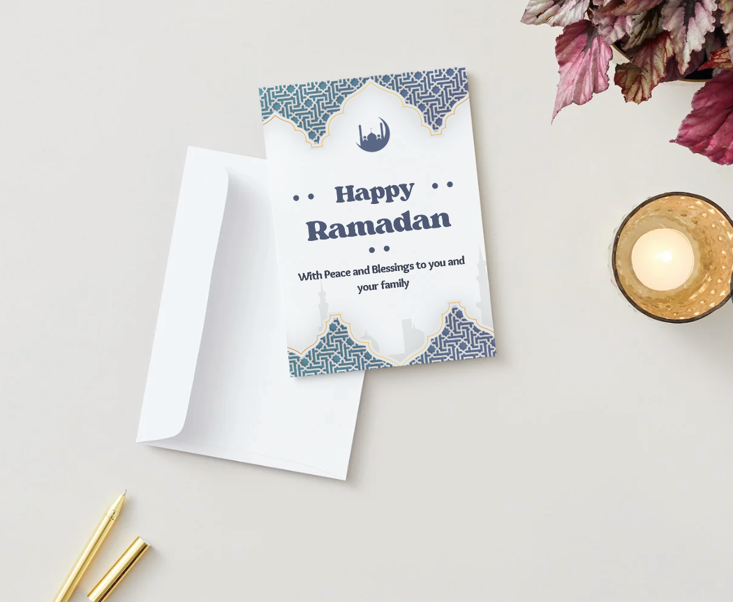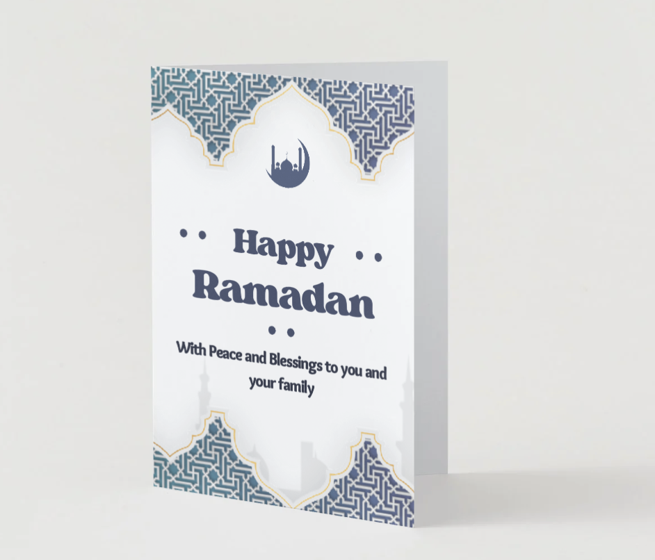 Send warm Ramadan greetings with a card that blends tradition, elegance, and heartfelt meaning. The intricate geometric patterns, mosque silhouette, and soft blue tones create a peaceful design that reflects the beauty and reverence of the holy month.